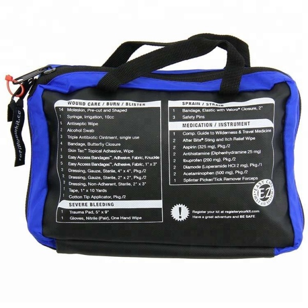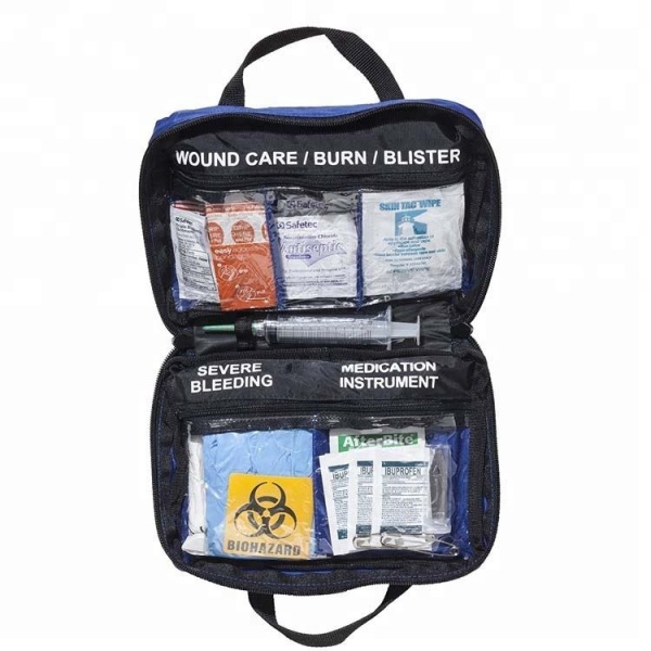 KategorieEnthaltene ArtikelSterile VerbändeMullkompressen, sterile Wundverbände, absorbierende PadsVerbände und BandagenElastischer Verband, Dreiecksverband, KlebebandWundpflegeGemischte Klebeverbände, Alkoholtupfer, ReinigungstücherNotfallwerkzeugeScheren, Pinzetten, Sicherheitsnadeln, EinweghandschuheAndere EssentialsSofortiger Eisbeutel, medizinisches Klebeband, Wundpflasterblätter