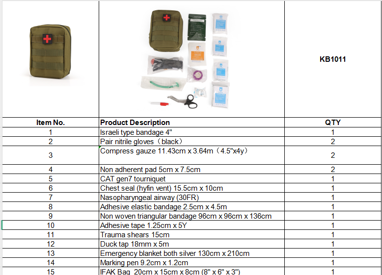 Yiwu Kebon Healthcare Co., Ltd bietet OEM/ODM-Anpassungen für Militär, Polizei und Rettungsorganisationen. Farbe, Logo und Inneninhalt der Tasche können vollständig nach Kundenspezifikationen oder nationalen Verteidigungsstandards angepasst werden.